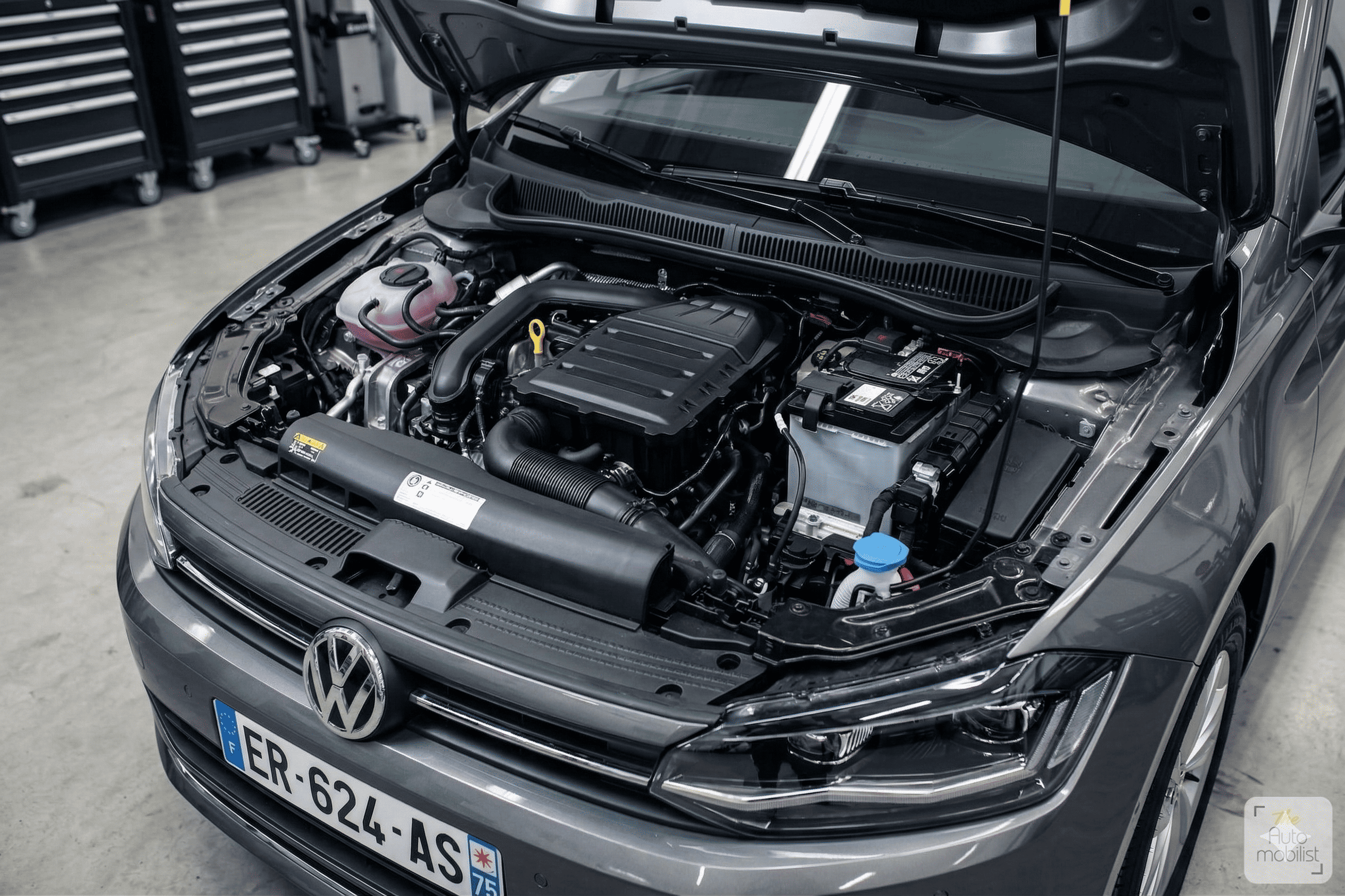 Le problème le plus fréquent sur EA211. La pompe à eau et le module thermostat sont logés dans un boîtier plastique entraîné par une petite courroie dédiée. Ce boîtier se déforme sous la chaleur et provoque des fuites de liquide de refroidissement. Surveillez le niveau du vase d'expansion et les traces de résidus blancs autour du bloc.